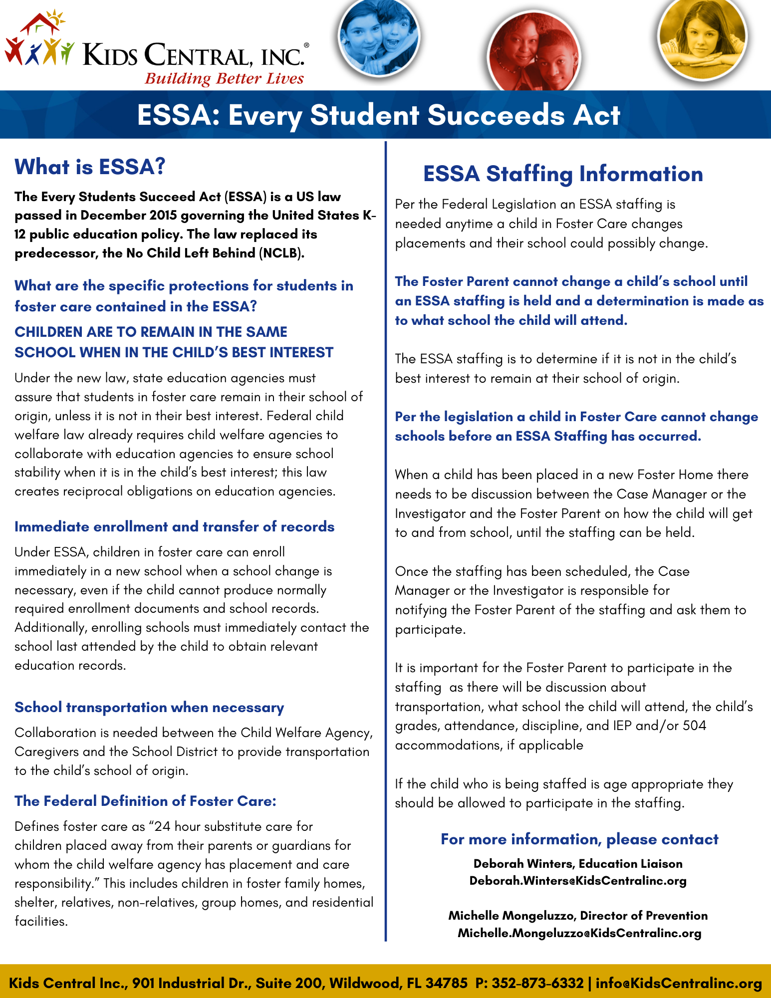 Kids Central’s Education Program provides a collaborative approach for foster children in Circuit 5 (Citrus, Hernando, Lake, Marion, and Sumter Counties) to identify unmet needs affecting school performance. Kids Central’s Educational Liaison manages all aspects of the collaborative team around the child’s academic success. Further collaboration exists within the Circuit 5 judiciary system, as academic performance is reported to the court during routinely scheduled court hearings, as well as status hearings when significant academic changes for students occur.